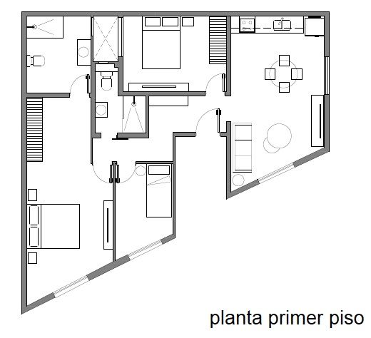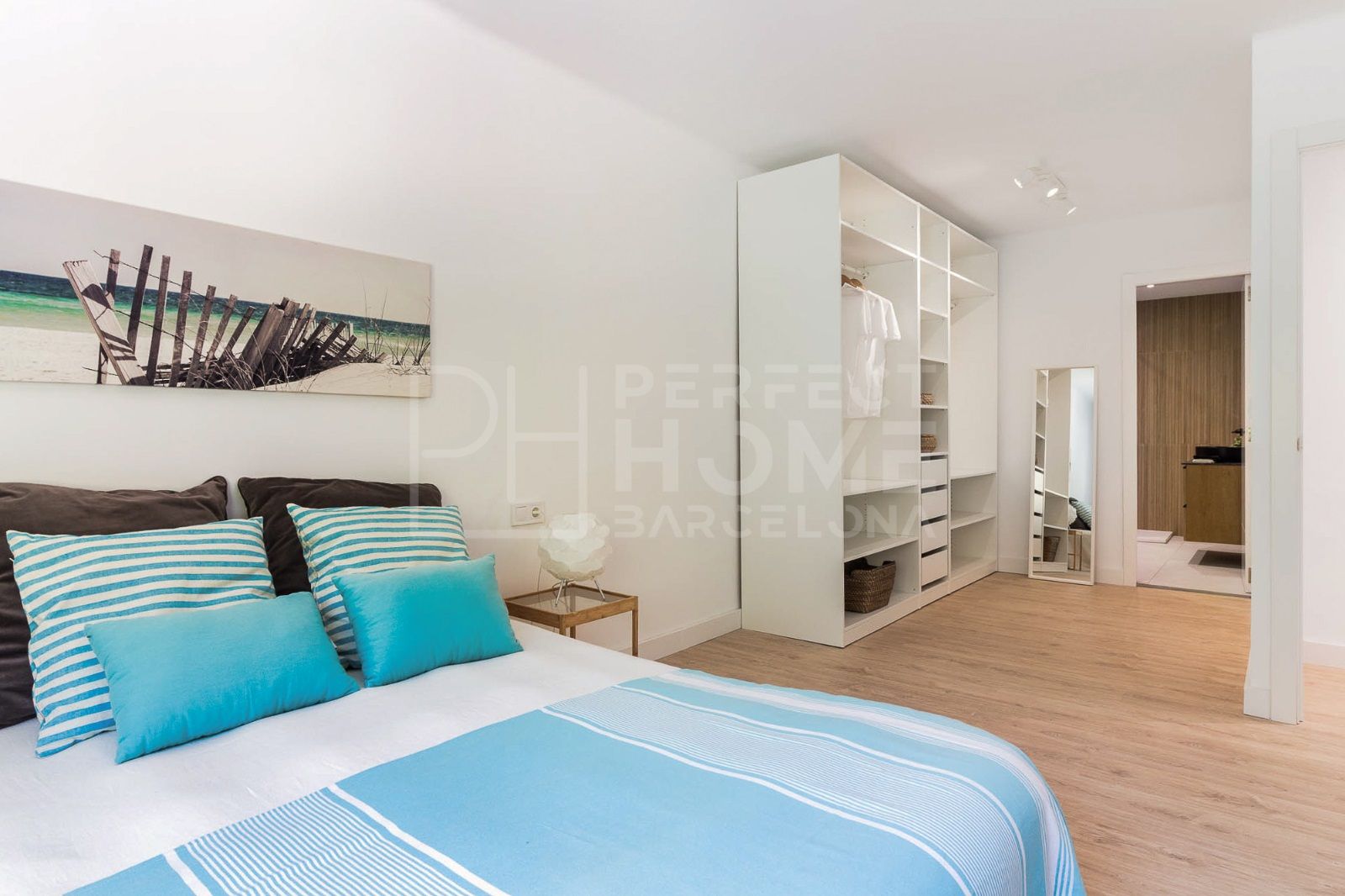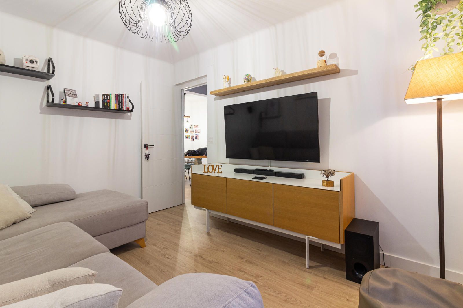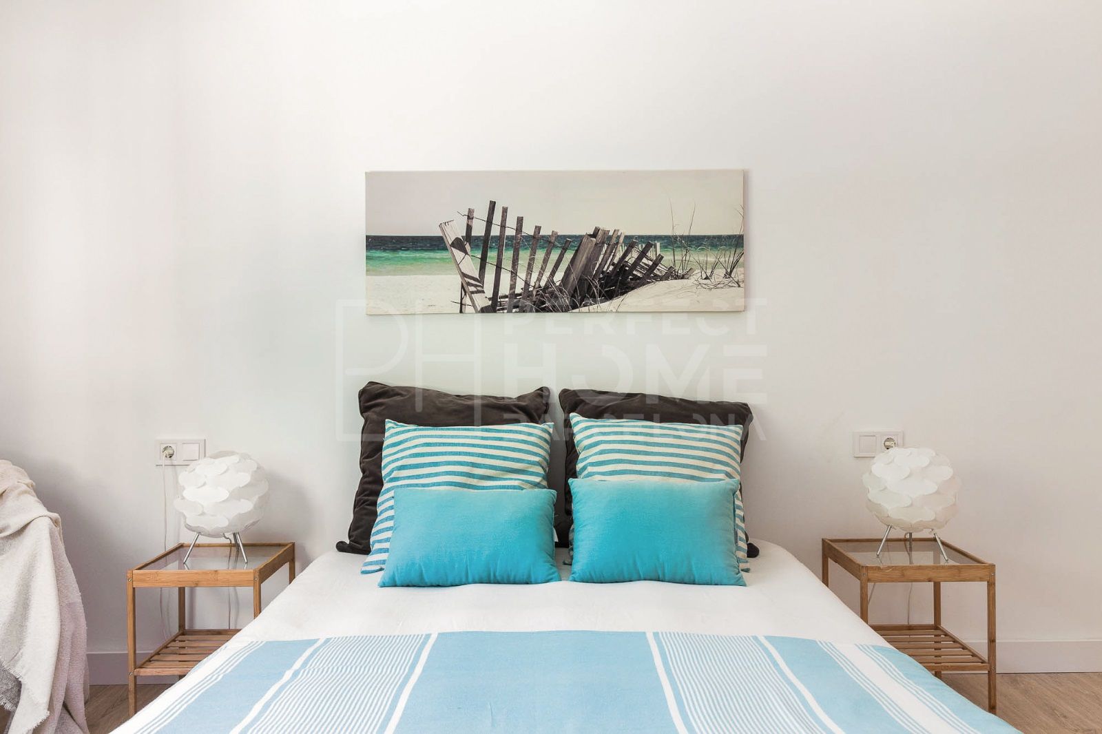En la primera planta, una vivienda de 89m2 construidos, luminosa, recién reformada con un diseño espectacular y gran calidad. Cocina americana con comedor, 2 dormitorios (1 doble y 1 individual) y 2 baños, y sala de TV. El dormitorio principal es enorme, y dispone de vestidor y baño en suite.